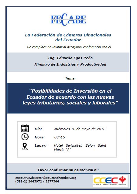 Nos permitimos extender una cordial invitación al Desayuno Conferencia, organizado por la Federación de Cámaras Binacionales del Ecuador, FECABE, sobre “Posibilidades de Inversión en el Ecuador de acuerdo con las nuevas leyes tributarias, sociales y laborales”, el cual estará a cargo del Ing. Eduardo Egas Peña, Ministro de Industrias y Productividad.
